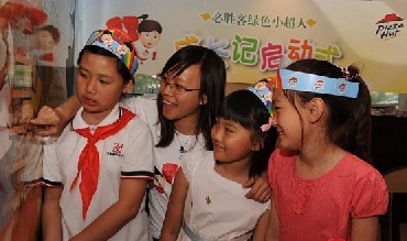 京城首家“必勝客綠色小超人主題餐廳”近日正式揭幕。大學生志愿者們帶領來自呼家樓小學的首批“必勝客綠色小超人”在這里開始了一場“畫手絹游戲”。