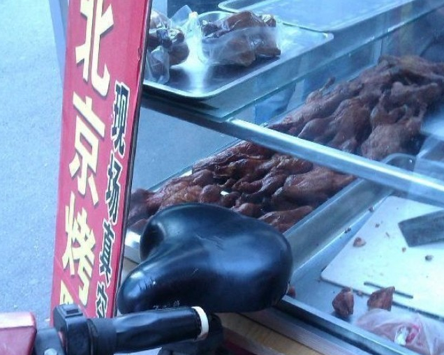4月8日,記者對北京西站等地的烤鴨市場進(jìn)行了暗訪。北京西站旁的北蜂窩西路上,一個(gè)流動(dòng)攤販的推車前掛著“北京烤鴨25元/只”的牌子。推車的玻璃柜里陳列著20多個(gè)烤好的鴨子,玻璃柜上方還放著已經(jīng)包裝好的“全聚德”和“金聚!钡目绝,旁邊還有幾個(gè)全聚德烤鴨的包裝袋。