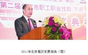 4月20日下午,在“2011年度北京餐飲十大品牌、50強企業(集團)、100強餐飲門店暨第二屆北京市職工職業技能競賽頒獎典禮”上,北京市商務委員會副巡視員趙立宗代表北京市商務委發表了現場講話,肯定了這些在北京餐飲行業默默奉獻的商業精英,褒獎了那些為北京餐飲業做出突出貢獻的品牌企業。