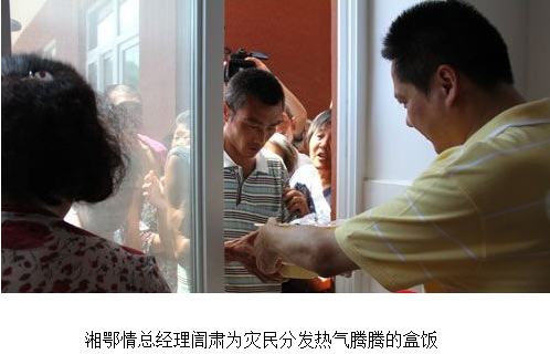 災(zāi)害發(fā)生后,湘鄂情董事長孟凱對災(zāi)民的生活十分牽掛,當(dāng)他在網(wǎng)上看到災(zāi)區(qū)人民不能吃到熱飯菜,只能靠方便面充饑的報道后,心里非常著急,決定要為災(zāi)民盡一點綿薄之力。