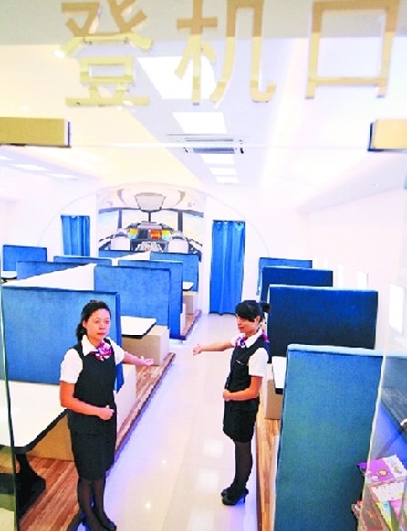 “歡迎登機!”一進入餐廳,你就能看到服務員彎著腰,做出歡迎的手勢!拔覀兊姆⻊諉T都是參考空姐的標準來招收,要求身高160cm以上,長相清秀,笑容甜美等。”黃慧玲介紹說,服務員統一著空姐制服,上班前還得接受餐飲禮儀和空姐服務方面的培訓。