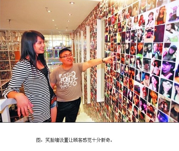 店主鄭鑫龍說,開業前一個月,他通過微博征集泉州市民的笑臉照!翱偣舱骷3500張照片,最后我選取了1000張,用特制的墻紙做成笑臉墻。”據介紹,照片上的人物大多數是泉州人,其中的主體是1993、1994年出生的美少女,她們的笑容或俏皮,或甜美,或秀氣。此外,還有少部分照片反映是寶寶的可愛表情。一邊看著美少女,一邊用餐,可以勾起人們的食欲,或許老板想營造的就是秀色可餐這一概念。