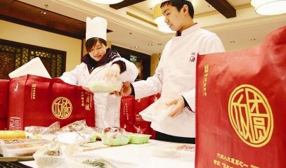 近日,蘇州某飯店服務員為“打包年夜飯”配菜。春節將至,蘇州一些“老字號”餐飲單位推出品種豐富的半成品“打包年夜飯”,讓市民在家中就能吃到美味可口的年夜飯。這樣既節儉又方便,受到消費者青睞,銷售十分火爆。