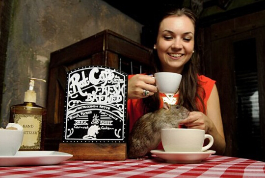 老鼠咖啡屋的靈感源于當前日本流行的“貓咖啡屋”,那里的顧客午休時可在貓的陪伴下吃午餐。而倫敦的老鼠咖啡屋中,則是老鼠相陪。如果你胃口夠好,也可在老鼠咖啡屋中就餐。