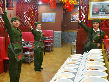 2015年1月10日,在甘肅省平涼市一家新開張的火鍋店,服務員們全部扮成“紅衛兵”的樣子,每當有客人走進大廳,店門口的迎賓就喊:“老鄉您好!歡迎下鄉改善伙食。”在這家以“紅色餐飲”為主題文化的火鍋店,記者還發現,這家火鍋店吸人眼球的不僅僅是服務員“紅衛兵”的打扮,還有許多新鮮的叫法更是讓人好奇,甚至有時候讓前來消費的顧客忍俊不禁。店內服務員管同事叫“社員”,稱包廂為“公社”,稱主管為“隊長”,他們還把菜譜叫“革命語錄”,把啤酒叫做“地雷”,白酒稱作“炸彈”,餐廳紙是“雞毛信”,代金券是“糧票”。