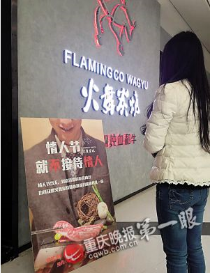 位于南岸區(qū)時代星光廣場的火舞炭燒主營炭燒、烤肉,他們打出的廣告詞是———情人節(jié),就不接待情人(如圖)。“我已經給服務員打好招呼,遇到手挽手成雙成對的恕不接待!崩习宀虖┬瘢槿斯(jié)不能只有耍朋友的開心了,單身的人悲傷度過。他準備唱反調到底,他還會給屆時前來就餐單身人士準備一份禮物。