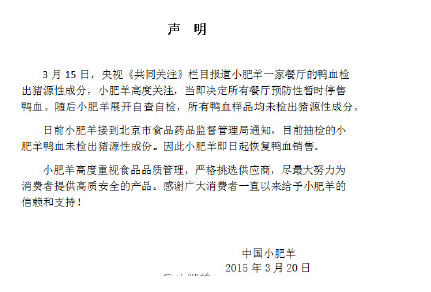 20日晚間,小肥羊再次發(fā)布聲明,稱自從被央視曝光后,公司便展開自檢自查,所有鴨血樣品均未檢出豬源性成分。“目前小肥羊接到北京市食品藥品監(jiān)督管理局通知,目前抽檢的小肥羊鴨血所有樣品均未檢出豬源性成分,因此小肥羊即日起恢復(fù)鴨血銷售”。