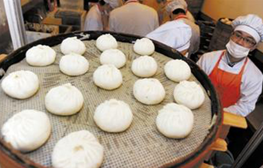 在甘其食,每個人都會看到壘得很高的蒸籠,如果細心一點你會發現,其他包子店,頂多只能壘6層,不是不想多蒸幾籠提高效率,而是再高就熟不了了。甘其食最高能夠達到13層,“從9層到10層再到13層,這個是經過了多少次試驗、重新定制蒸鍋等設備才能達到的。”童啟華說,不光如此,下面幾層以下只能蒸肉包,中間幾層蒸豆沙包等都是有白紙黑字規定的,最上面只能蒸青菜香菇包。“蒸包子是有講究的,肉是生的,青菜香菇是半熟的,一定要同時熟才行。”
