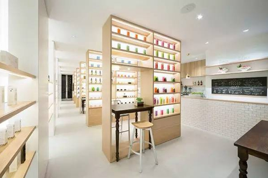 為了最大限度地突出產品本身,整個空間以白色為主色調,Nendo 設計團隊設計了很多原木材質的擱架單元,從地面架起至天花板,就像是圖書館里的書架似的。書架內置了白色透光性極強的發(fā)光裝置,映襯著放置在擱架上包裝色彩繽紛的產品,給人自然、溫暖的觀感。