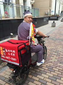 你可以想象這樣一個場景:車來車往的都市,長安街上,一個大俠裝扮的古裝小哥騎著電動車風馳電掣,一桿杏黃旗上書“蝦鼎記”在車流中隨風飄蕩,無數路人好奇地拿起手機拍照、發(fā)微博和朋友圈,甚至要求合影。到了客戶家:“大俠您好,我是蝦鼎記神行太保……”客戶接過熱氣騰騰的海鮮,驚喜之余又接過一個骰盅、四枚骰子,點餐即可獲得一次搖骰子機會,四個六免單,四個六以外點數相加減掉相應錢數。于是,喜上加喜。