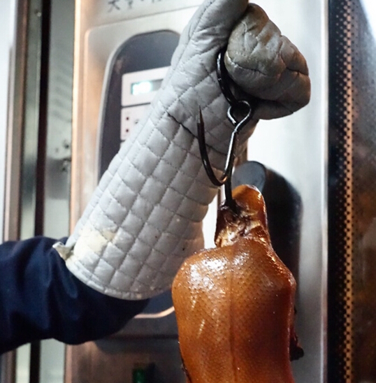 烤鴨一出爐,就會被立刻分割,如果沒有馬上做成漢堡送到運氣超好的客人的嘴里,就會把分好的鴨皮和鴨肉分開專門保溫。對烤鴨了解至極的大董專門為鴨皮和鴨肉分別設(shè)計了不同的保溫箱,溫度和濕度都不一樣,以保持剛出爐的風(fēng)味。鴨子最多在里面呆四十分鐘,這是大董認(rèn)為可以保持鴨皮噴香酥化、鴨肉多汁鮮嫩的完美狀態(tài)的時間范圍。在這個時間內(nèi)沒有用完的鴨子,就不要了。