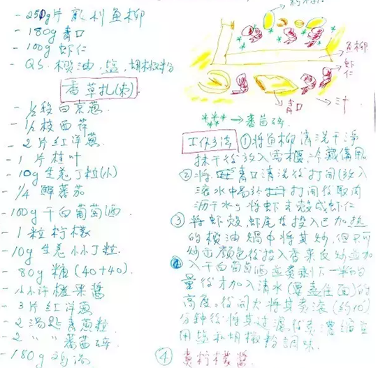 阿KEN的手繪菜譜很有藝術(shù)感,除了常規(guī)的做法之外,還有菜品擺設(shè)的外觀圖。徒弟們看過之后,就能做出同樣效果的菜品來。