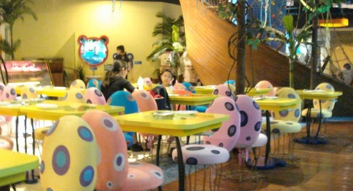 曾經(jīng)紅極一時(shí)的連鎖兒童主題餐廳“芭迪熊”在其第一家店中,讓小朋友吃飯前先進(jìn)行探險(xiǎn)。小朋友們需要登上一條木制“帆船”,開始探險(xiǎn)之旅:在沙灘區(qū)有“椰子樹”和花朵形餐桌;在海洋區(qū),獨(dú)一無(wú)二的水母椅子、可愛(ài)的大蘑菇飲料站都很吸引小朋友。