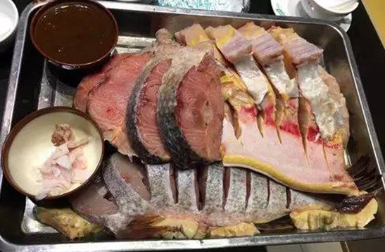 我們指著其中一缸里的魚說:這個多少錢一斤?廚房主廚回答:128元/斤。其實我也不知道那是什么魚,養在缸里看著也很小條,就說要不弄兩條?廚房主廚就立馬用網撈出兩條,看都不給我看一下,立即拍死在案!我還沒回過神呢,說兩條你就弄兩條,我怎么知道那魚一條有多重啊!結果一稱,兩條魚9斤多!我們就4個大人1個小孩,明顯吃不完呀!老板喊冤