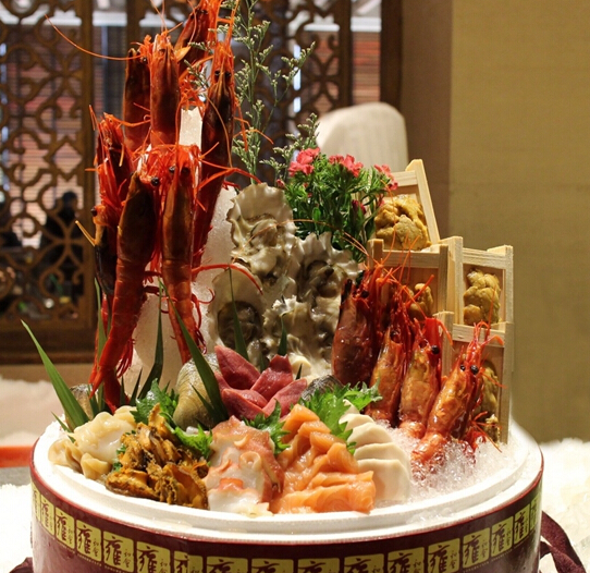 雍和會(huì)的迭代,則很多體現(xiàn)在“姿造”的升級(jí),從制冰機(jī)的效率提升,到桌面上的聲光電元素,最明顯的是自助餐一入座就直接上桌的拼盤(pán),從開(kāi)始的單盤(pán),到大半米高的三層鐵盤(pán),并且專門(mén)設(shè)置了集水處保持桌面清潔。
