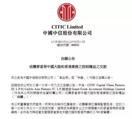 根據(jù)此前麥當(dāng)勞公布的協(xié)議,中信集團(tuán)旗下的中信股份、中信資本控股、凱雷投資集團(tuán)和麥當(dāng)勞聯(lián)合宣布達(dá)成戰(zhàn)略合作并成立新公司,新公司將以最高20.8億美元的總對(duì)價(jià)收購(gòu)麥當(dāng)勞在中國(guó)內(nèi)地和香港的業(yè)務(wù)。中信集團(tuán)旗下中信股份和中信資本在新公司中將持有共52%的控股權(quán),凱雷和麥當(dāng)勞分別持有28%和20%的股權(quán)。