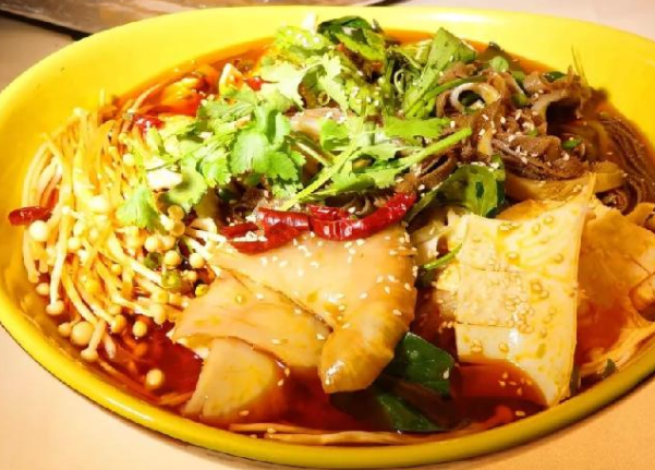 小本經營者們選擇冒菜,很大一個原因是門檻低、烹調易操作,冒菜的“冒”字是非常形象的動詞,燒一鍋麻辣鮮香的湯汁,把一份菜用竹勺裝好在鍋里大火煮熟,盛入碗里再舀一勺湯汁,加入調制的各種調料。和火鍋類似,冒菜原料不限,什么食材都可以一起冒出一碗噴香的佳肴。