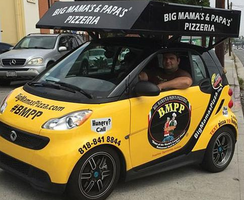 Big Mama‘s&Papa’s曾使用傳統的貨車來運送巨型披薩,但如今它已經擁有了專門的定制車輛。車身為黃色和黑色,印有連鎖店的電話號碼和網站名稱,某些部位還寫有“Big Mama&Papa‘s”的標志。最引人注目的是車頂上安裝著巨大的收納箱,運送期間可以放置巨型比薩。
